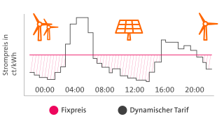 Der Börsenpreis für Strom ist u.a. davon abhängig, wie viel Strom gerade produziert wird und wie hoch die Nachfrage ist. Da der Anteil erneuerbarer Energien am Strommix in Deutschland bei mittlerweile über 50 Prozent liegt, wird der Strompreis wesentlich davon beeinflusst, wann und wie viel Wind weht und ob die Sonne scheint. Mit einem dynamischen Stromtarif können Kundinnen und Kunden ihren Verbrauch danach ausrichten und von fallenden oder sogar negativen Strompreisen profitieren.
